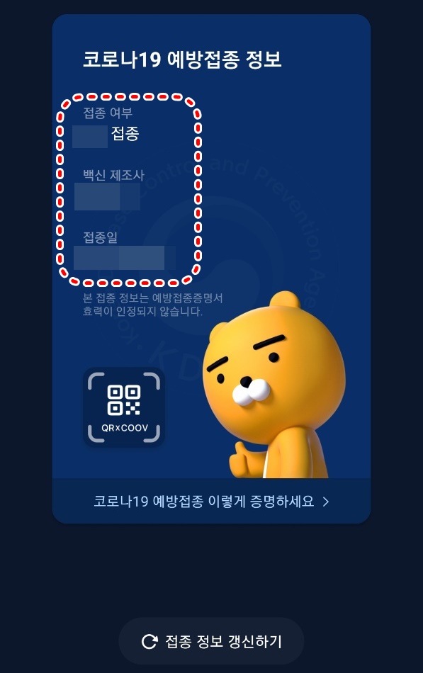 하는 방법은 네이버앱이나 카카오톡에서 큐알(QR)코드 체크인을 하게 되면 쿠브(COOV)앱과 연동을 하여 접종 증명서 보기를 통해서 증명하실 수 있습니다.