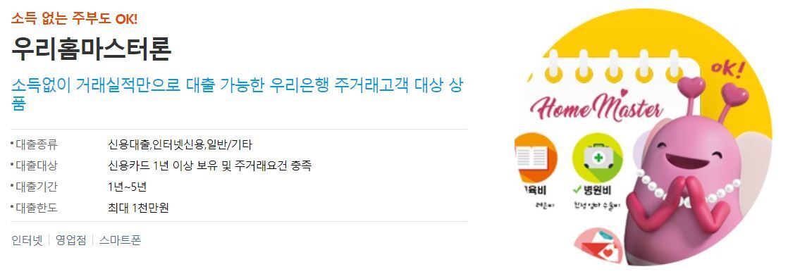 ▶ 대출 특징 : 소득증빙 없더라도, 우리은행 주거래 고객이면 신청 가능, 주부도 대출 신청 가능함.