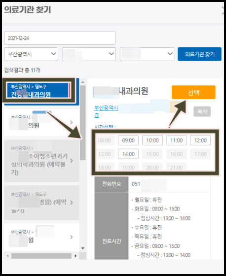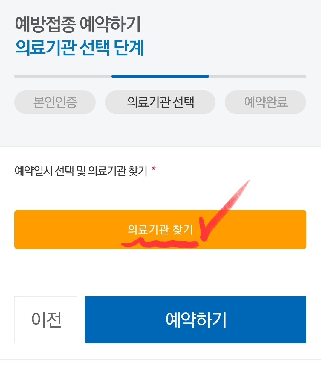 그 다음으로는 접종받을 병원을 찾아야 하는데 사전예약 시스템에서 자동으로 조회하여 가까운 곳의 병원을 찾아주므로 편리하네요.