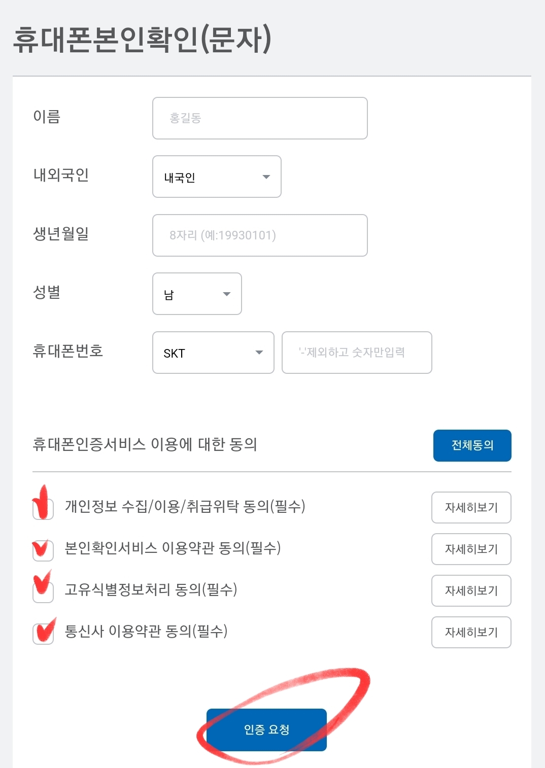 본인인증은 휴대폰 인증으로 선택하고 본인인증 바로가기를 클릭합니다. 이후 이름과 생년월일, 휴대폰 번호를 입력하고 인증동의를 선택하고 '인증요청'을 합니다.
