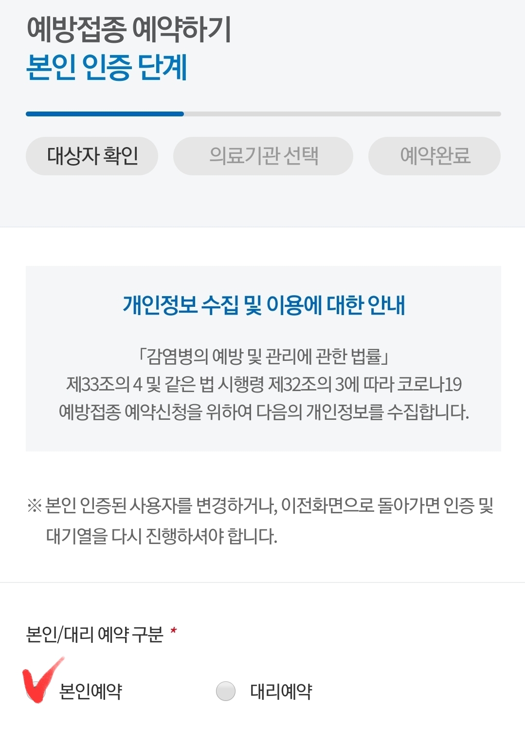 잠시 후 SMS로 날라온 인증번호를 입력 후 '확인'을 클릭합니다. 본인인증이 완료되면 예약대상자가 본인인지 대리예약인지 체크해야 다음단계로 넘어갑니다.