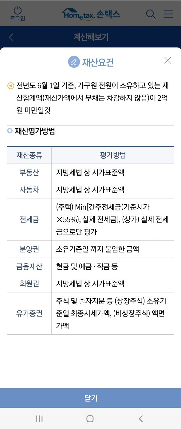 여기서 말하는 재산은 부동산, 자동차, 전세보증금, 주식, 적금, 예금 등이고 빚이 있더라도 차감해주진 않습니다.