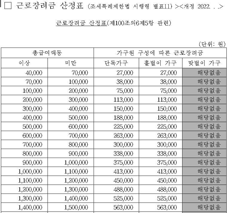 * 지급액은 대략적인 것으로 개인에 따라 다를 수 있습니다. 정확한 것은 국세청 홈페이지 근로장려금 계산기에서 확인할 수 있습니다.