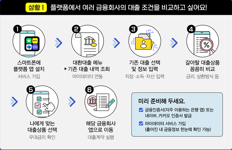 👉 대환대출 서비스를 편리하게 이용하려면 ① 대출비교 플랫폼 앱 설치 및 가입, ② 해당 플랫폼 내 마이데이터 가입을 미리 해 두면 좋습니다.